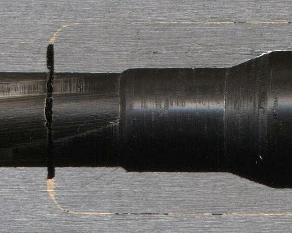 This close-up shows the tearing of the chamber by a dull chambering reamer, just below the neck and in the neck area. The "smushed" rifling in front of the chamber neck is the leade, or throat. The longitudinal lines in the grooves are from the rifling cutter, and the radial marks on top of the lands are from the precision reaming of the bore diameter prior to rifling.