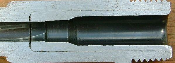 This sectioned barrel shows the chamber insert and solder joint. This barrel was originally 7x57. It is now chambered in 7.62 NATO. This is not a particularly prudent conversion as the action was not designed for subsequent use with commercial .308 Winchester ammunition. The gap in front of the chamber is thought to be caused from gas cutting of the soft solder joint.