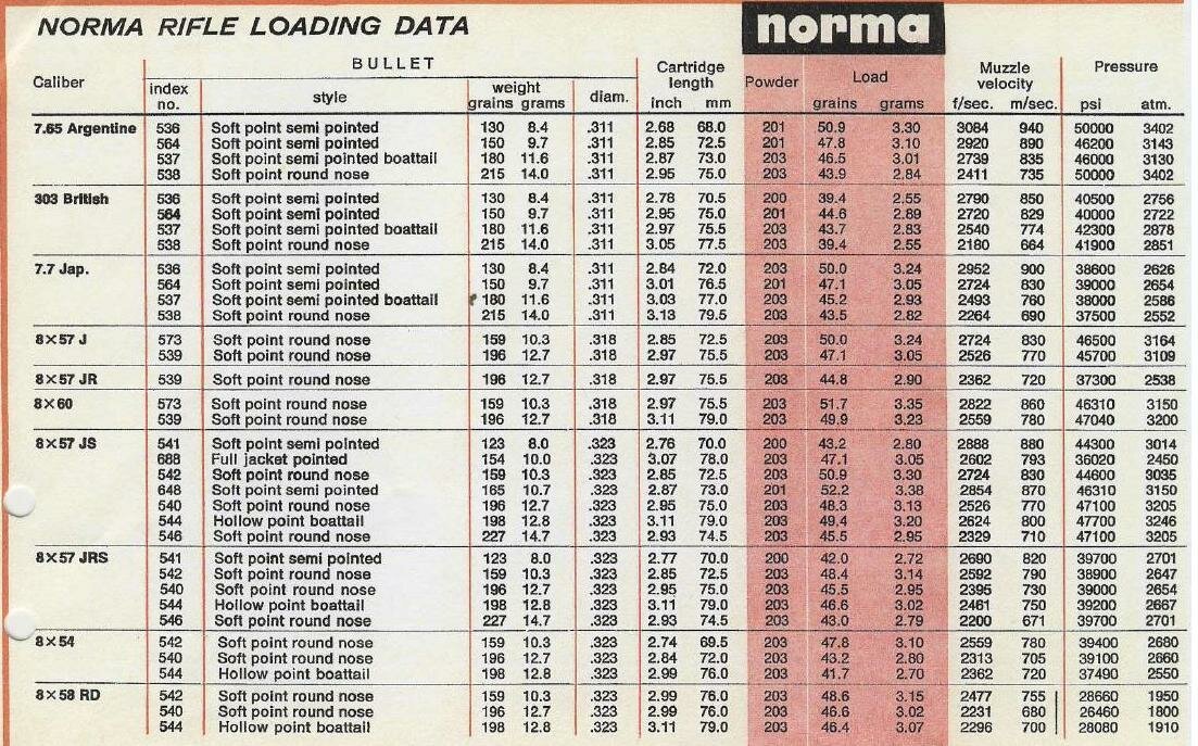 The Norma load data below is from an older 1960s-70s era factory manual. Norma sent this to me. You'll notice down at the bottom, the 8x58RD data. In the far right columns are the pressures listed in both PSI and "atm" meaning atmospheres... BAR. See the numbers? The highest is 1950 BAR. Now go back and look at the CIP maximum average chamber pressure of 3200 BAR. The psi of 1950 BAR is 28,282. Do you see how nicely that agrees with the Norma loading data?
