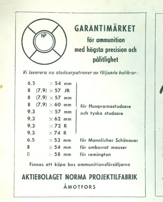 Figure 4. Advertisement for Norma ammunition in 1951 issue of Svensk Jakt magazine.