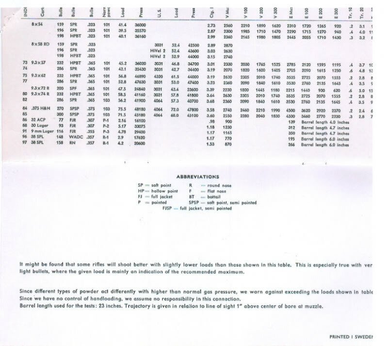 Figure 10. Cartridge load listing from Norma factory booklet. Exact date is unknown,