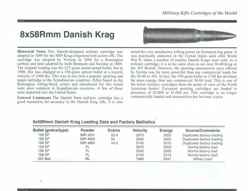 Footnote 1- I refer to the 8x58R Danish cartridge as 8x58RD because the 8x58R Sauer cartridge is sometimes confused with it. Footnote 2- A slight, but pertinent divergence here. The pressure values in the Norma literature are given as PSI (pounds per square inch) and the European convention of atm. (atmospheres). As has been discussed in any good reloading manual and numerous articles in books and shooting magazines for decades, that before the late 1960s, all pressures were measured indirectly, mainly by a copper crusher type of instrumentation. The American standards developed by SAAMI/ANSI refer to the figures derived from copper crusher as CUP. Although it seems almost elementary to have to discuss this, it is very important to understand the copper crusher measures are indirect and relative measurements of pressure and may or may not represent the actual PSI. It must also be kept in mind that although most copper crusher methods of testing either by SAAMI or the European CIP and the various ammunition and reloading component companies, while supposedly rigorous and standardized as to protocol, are not easily, if at all, comparable to one another. Testing of identical loads by different laboratories often results in pressure values that differ from one another, sometimes by considerable amounts. So, what we are dealing with when discussing pressures is a quite relative and possibly broad range of results and we should never assume that these measures are definite universal values. But, over the decades the laboratories, physicists, and ballisticians have developed a level of confidence in their testing protocols and can recognize when things are operating within a normal and usually safe range of pressures. The sheer mass of scientific literature concerning the measurement of pressure is mind boggling, but a basic and useful understanding can be derived from such references as Bramwell(), Brownell (), Sharpe() and the better reloading manuals.