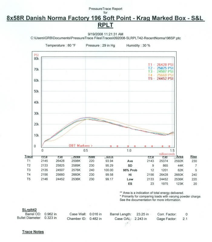 So, to summarize, there appears to be a clear ballistic differentiation between Norma factory ammunition marked for use in either the rolling block or the Danish Krag-Jørgensen. It is not a huge differentiation, but it is there. However, it appears that by the late 1950s or early 1960s, Norma was not making this differentiation anymore, and the ammunition was loaded to the slightly higher pressures and velocities. Given our understanding of the Swedish rolling block Model 67/89 and extrapolating from other similar historic period single shot military rifles, the practical operating pressure for the rifle appears to be around 25,000 PSI. I believe we can possibly conclude that the Norma technicians knew something about the rolling blocks and their pressure limits that they did not mention in the Norma publications. To iterate a previous observation, the pressure curves on all of the Norma factory ammo were quite smooth and uniform. Of course, the visual aspect of the pressure curves is due to the scales used on the graph, but the statistics show the same thing. I believe this indicates that the ammo was in relatively good condition, with the exception of the split case, and that age had not taken a great toll on its operating capabilities.