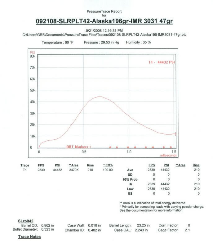 Before summarizing this project, I would like to show two more pressure graphs done during the testing. The first, Figure 21, shows a single trace with a pressure of 44,432 PSI and a velocity of 2,339 FPS. There is only one shot trace because this round showed explicit pressure signs and caused the bolt on my Schultz & Larsen RPLT 42 to be quite stiff and difficult to open. No sense in being stupid when things start acting like that.