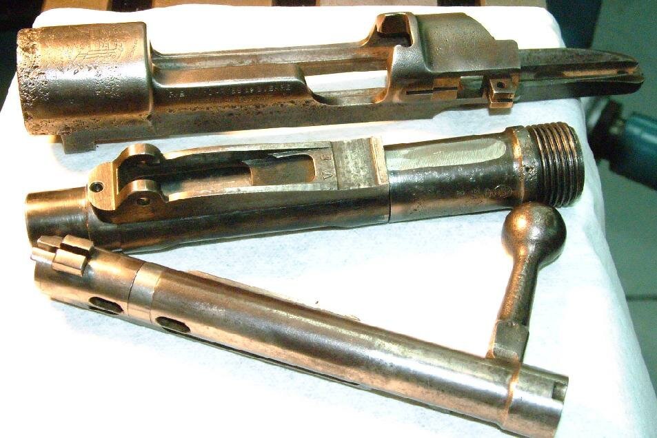 The only junk action I have in the shop disassembled is this Belgian FN Venezuelen Mauser. The only part that's salvagable is the bolt. With a new welded handle it'll go a hundred years in some custom rifle. I try and find a constructive use for the other parts like the barrel stub and receiver.