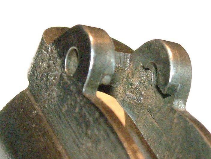 The elevation leaf slides back under this ledge and is kept firmly in place by the considerable pressure of the leaf spring (painful fingers will attest). The tiny pin that goes through that hole is there only in the event the elevator spring breaks. The tiny pin keeps the elevator from falling out of the rifle. Its a back-up retention design. The rifle's sights will function perfectly without that tiny pin.. until the elevator spring breaks.