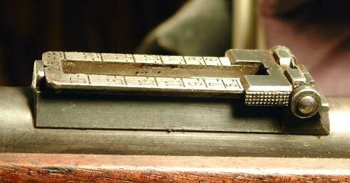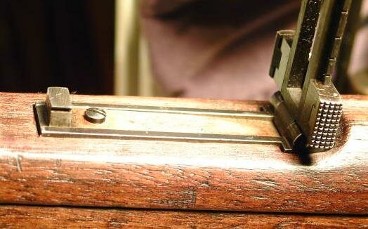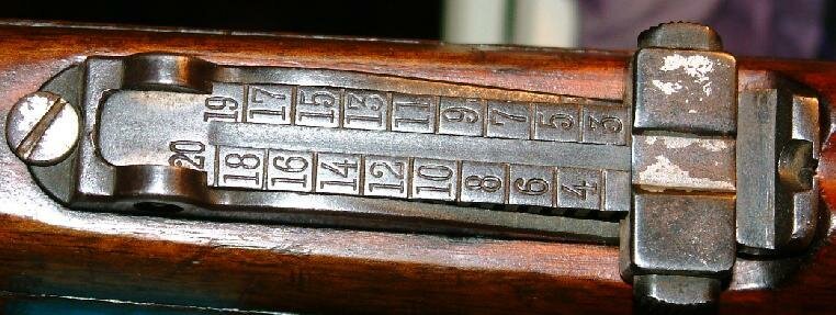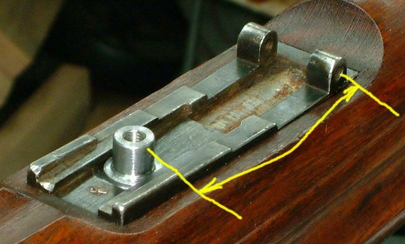 I have 3 loose m/96 rear sight bases and 2 m/96 rifles in the shop. They are not all the same distance between the ladder ears. But this dimensional discrepency is due mostly to injury or damage to the rear sight, or burrs on the metal. Most likely, though, its due to some damage in use or when the rifle was rebarreled and the rear sight base was removed and re-soldered to the new barrel. The back end of the sight base is often smacked to loosen it. This particular rifle bears that damage, though it is 109 years old.