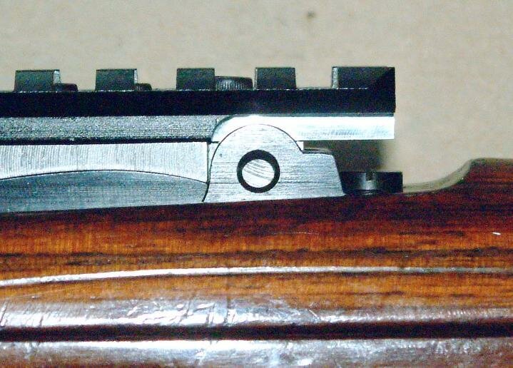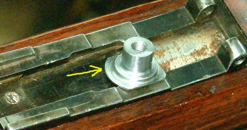 The hole for the pin in the sight base where the sight leaf pivots on isn't really a pin hole. Its one of the Mauser ideas to make sure the rear sight doesn't get lost if the leaf spring breaks and the leaf wants to drop out. There's a tiny diameter pin that protrudes into this hole to keep the sight leaf from being lost. I lathe turned a pin for a close fit and since this hole is pretty good size it lends great strength to the entire mount.