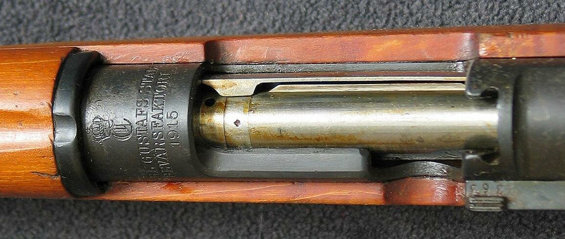 First thing you notice here is the grease in the action. That's pretty much standard Swedish military storage grease. This rifle appears to have been taken out of storage, put on a boat to America, sold by an importer to a private citizen and some years later sold on Gunbroker.com. At the least we can surmise this from the appearance of this rifle.